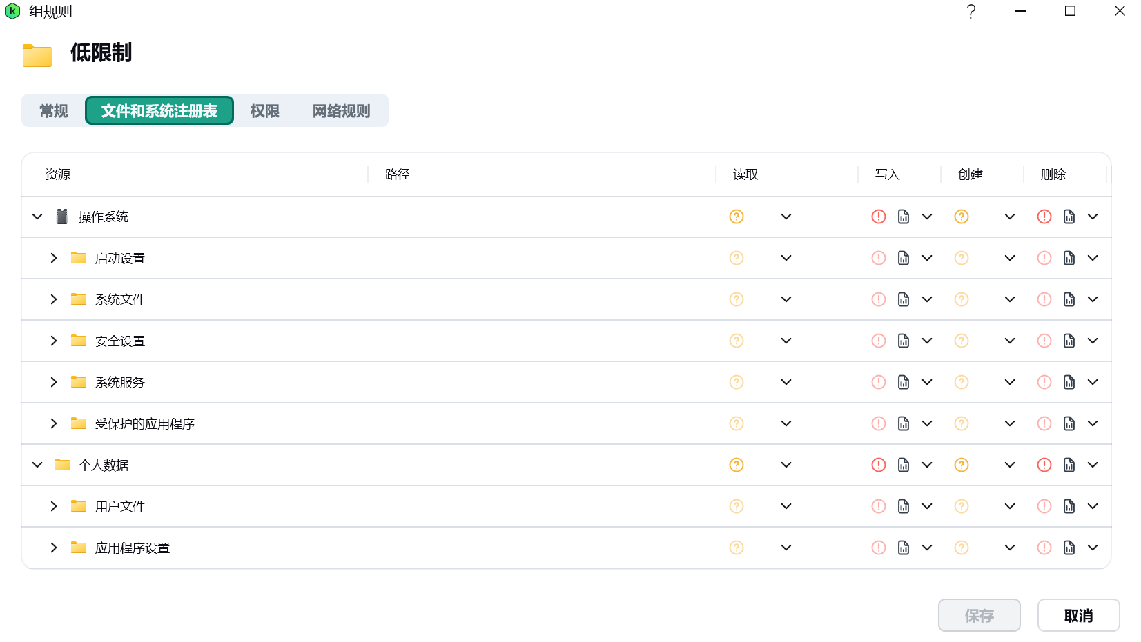 在「文件和系统注册表」下,写入和删除设置为「拒绝」并「记录事件」,读取和创建设置为「询问」。