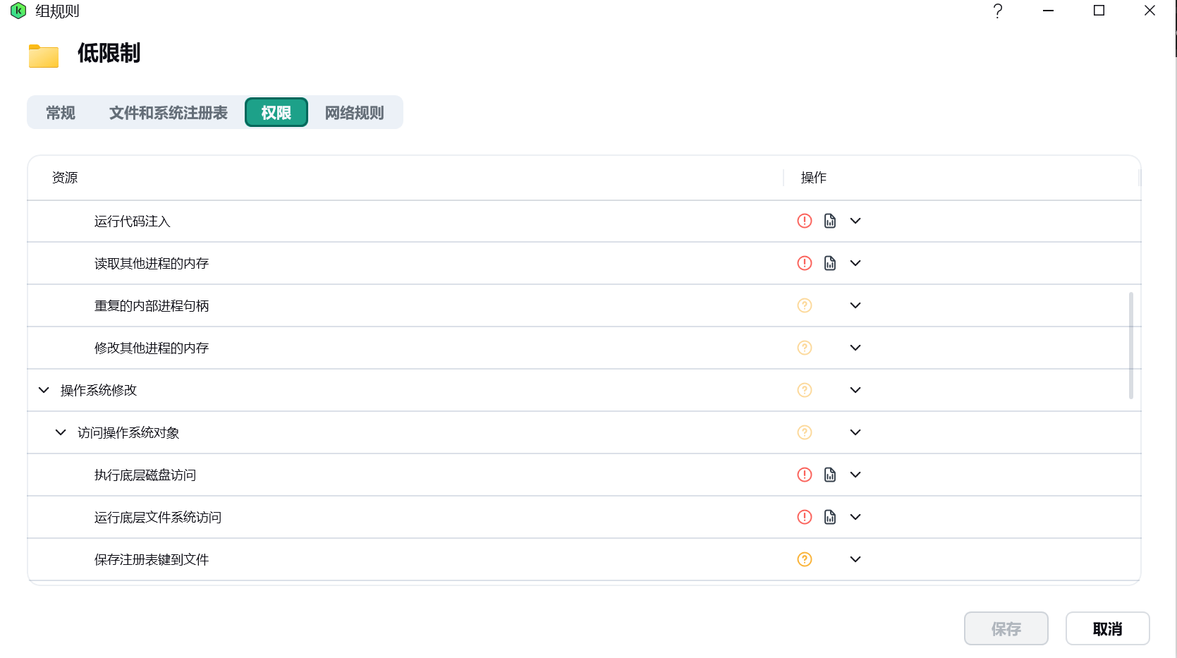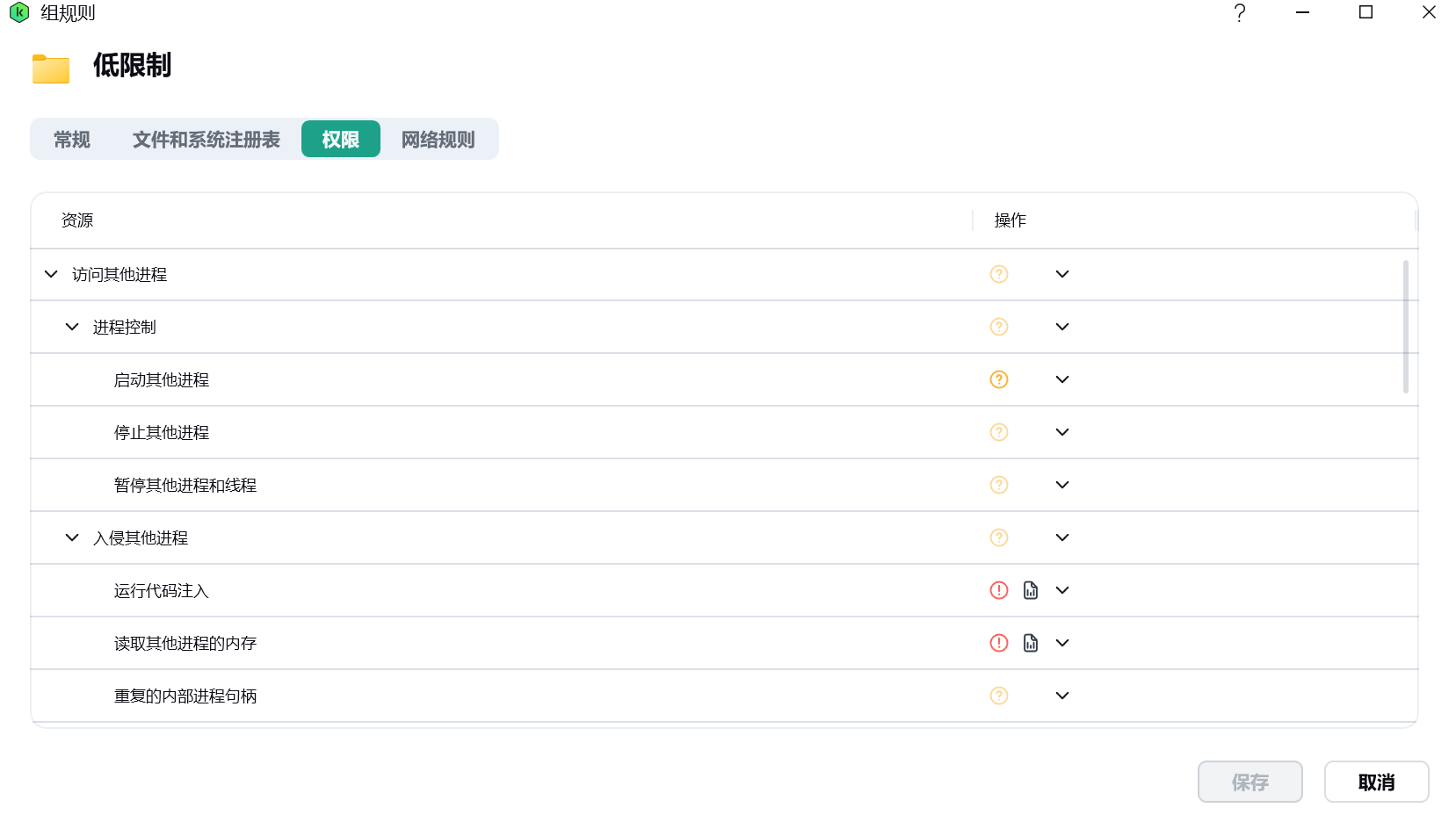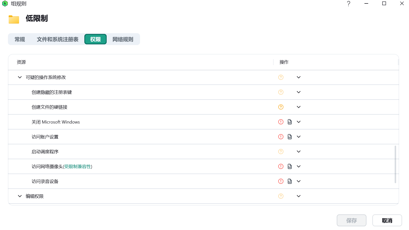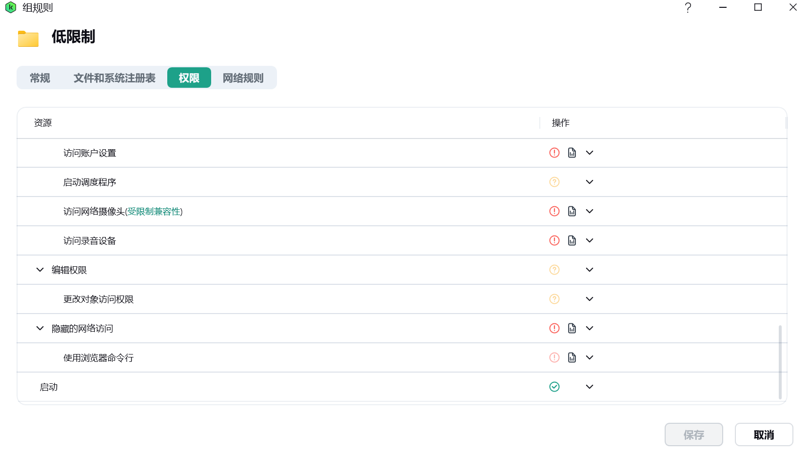 在「权限」下,运行代码注入、读取其他进程的内存、执行底层磁盘访问、运行底层文件系统访问、关闭 Microsoft Windows、访问账户设置、访问网络摄像头、访问录音设备、隐藏的网络访问和使用浏览器命令行设置为「拒绝」并「记录事件」,启动设置为「允许」,其他的设置为「询问」。新版这里没有出现 KLDriver,如果有应该也是「拒绝」并「记录事件」。